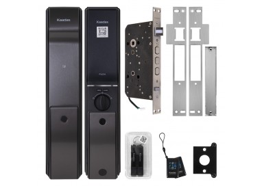 Kaadas K9-5W электронный врезной замок с механизмом "пуш-пул", такая конструкция позволяет открыть дверь одним нажатием на ручку замка. Корпус замка выполнен из металла черного цвета. Врезная часть имеет три ригеля. Замок оснащен встроенным биометрическим сканером отпечатка пальца. Открывается паролем - 10 шт., запоминает до 100 RF-карт и отпечатков пальцев, есть аварийный механический ключ. В замке есть функция голосового сообщения на английском языке. Главное отличие от модели К9-5 это наличие Wi-Fi и возможностью управления замком из любой точки мира. Рекомендуемая толщина двери 28-120 мм. Габаритные размеры: внешняя часть - 400 x 80 x 30 мм, внутренняя часть -460 x 80 x 32 мм.