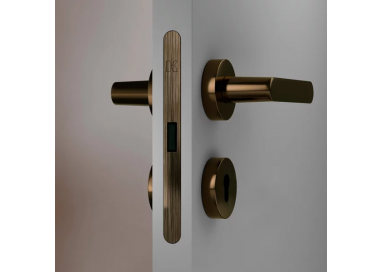 В версии Basic используется инновационная система запирания из нейлона и резины (магнитный ригель), которая делает замок бесшумным, а лицевая часть замка доступна в 10 вариантах отделки с видимыми винтами того же цвета.